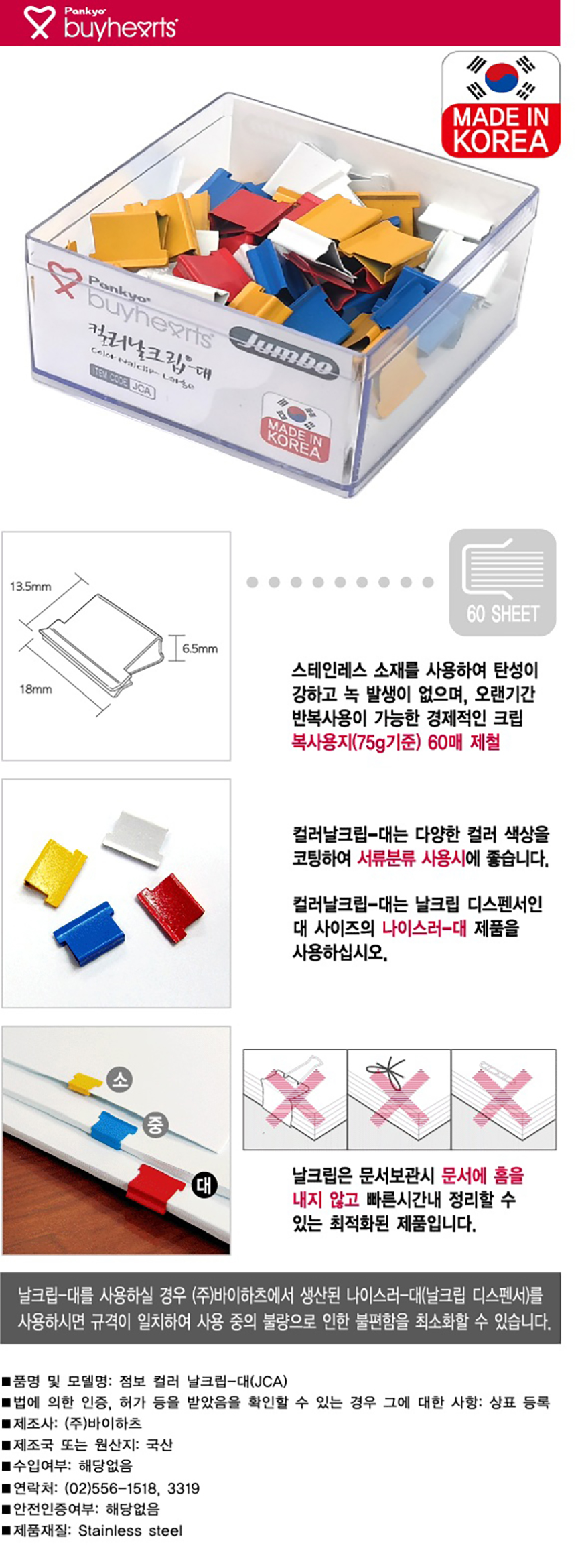 품명바이하츠 점보컬러날크립(심) 대(대, 컬러혼합, 60매용)